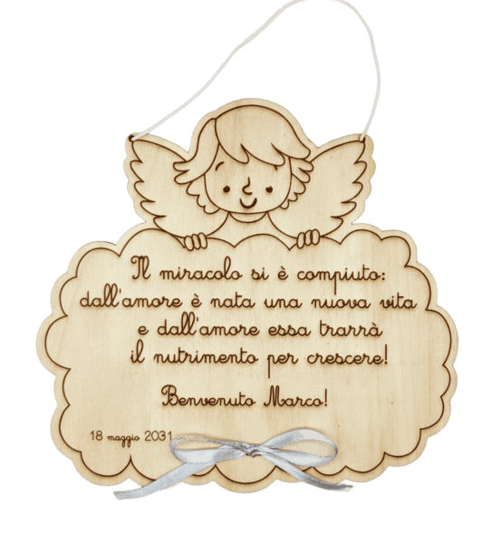 Ideale per una dedica alla nascita o per il battesimo questo angioletto accoglie il tuo messaggio inciso su legno compensato da 5 mm .
