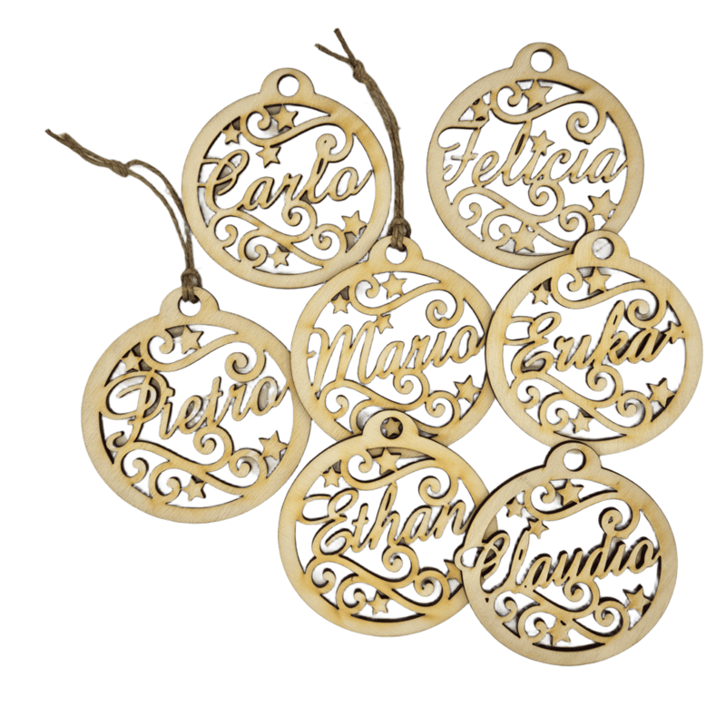 Palline in legno personalizzate con il nome, pronte da appendere.