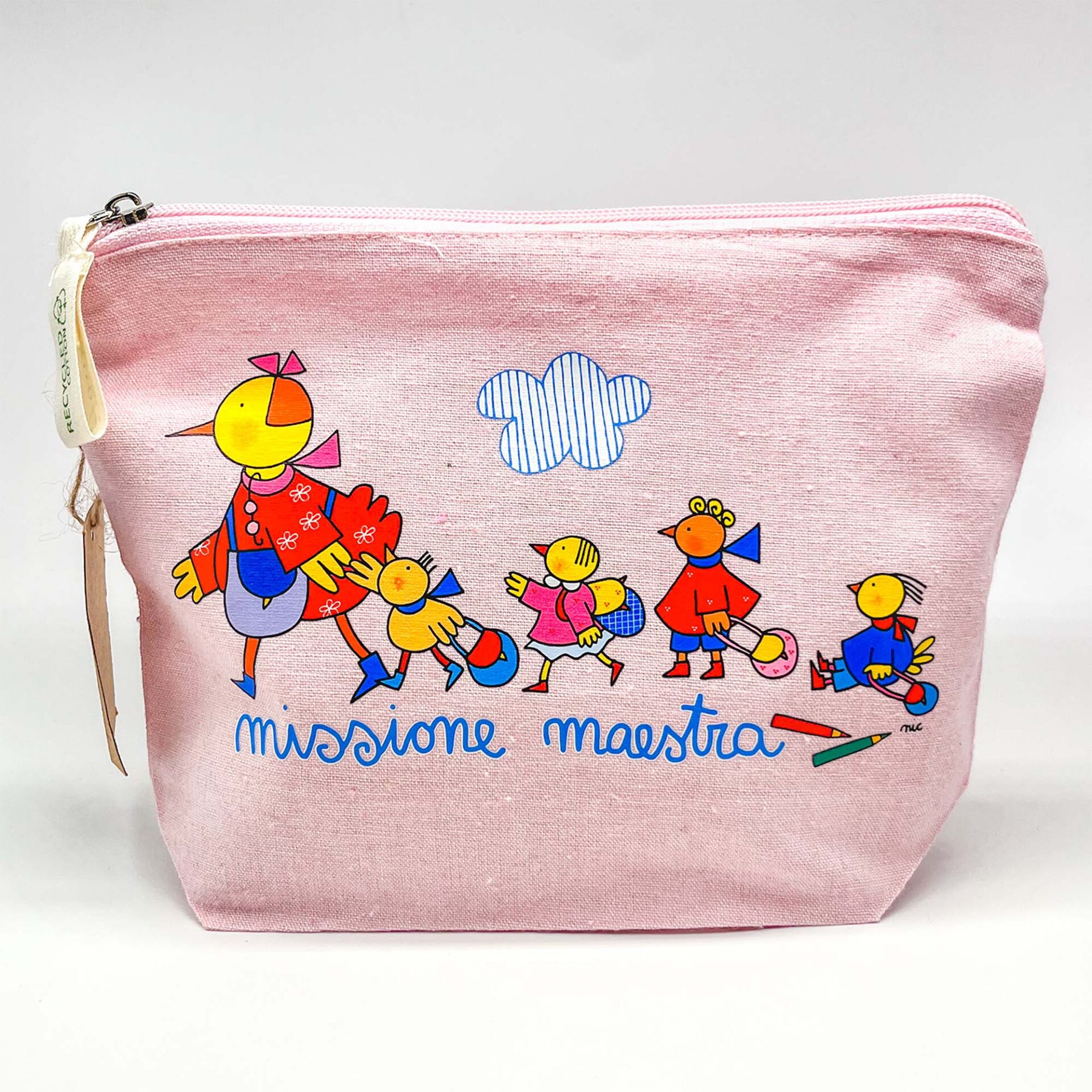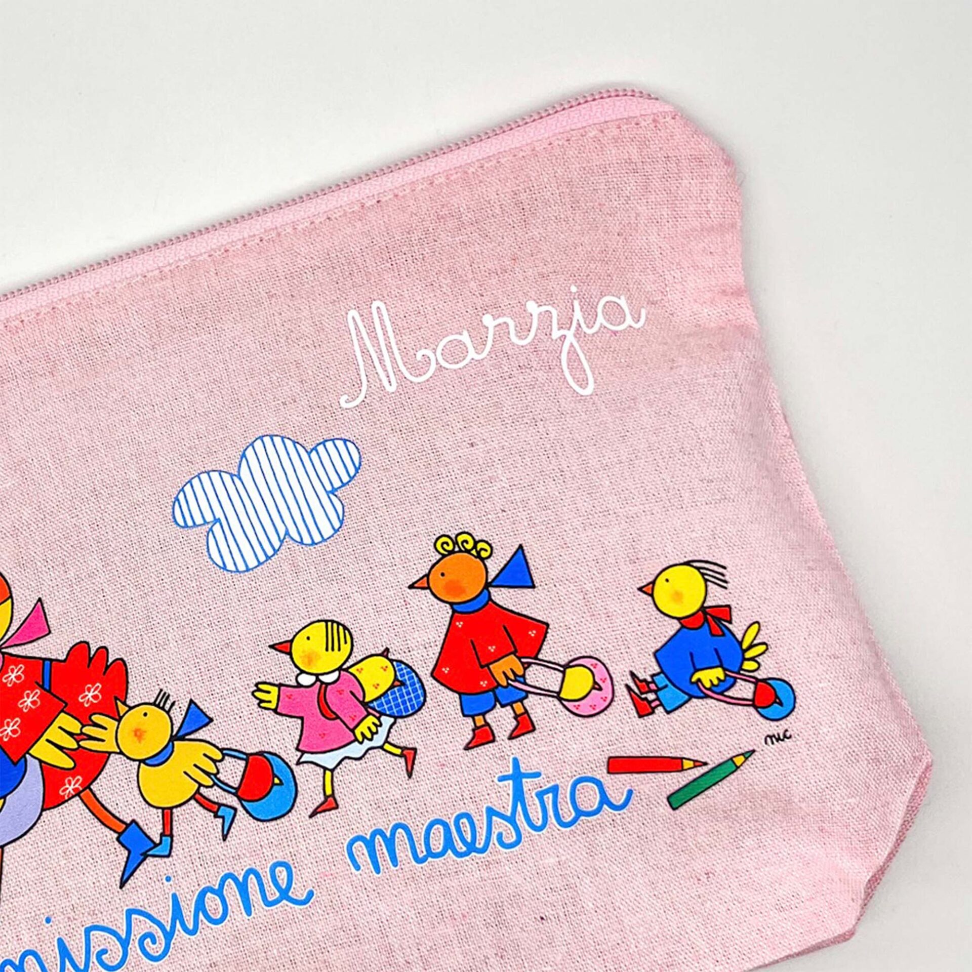 La pochette Missione Maestra nasce dalle illustrazioni di Nicoletta Costa, riconoscibili per il loro segno semplice e narrativo. È realizzata in cotone riciclato e stampata su richiesta nel nostro laboratorio La Grafica & Villa a Trieste, con attenzione alla resa dell’illustrazione sul tessuto. Puoi scegliere il colore della pochette e, se lo desideri, aggiungere il nome, che viene adattato graficamente all’immagine selezionata.