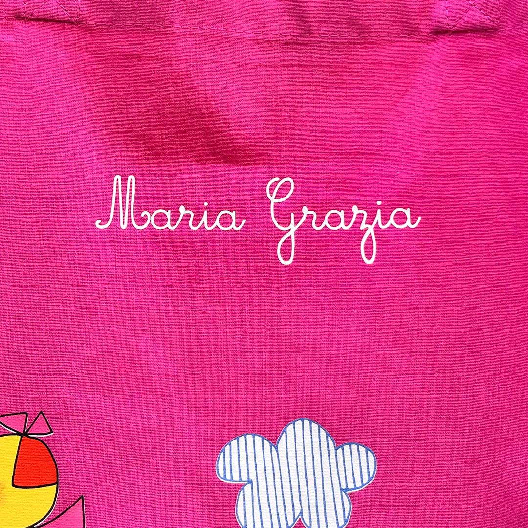 Puoi scegliere il colore della shopper e, se lo desideri, aggiungere il nome, che viene adattato graficamente all’immagine selezionata.