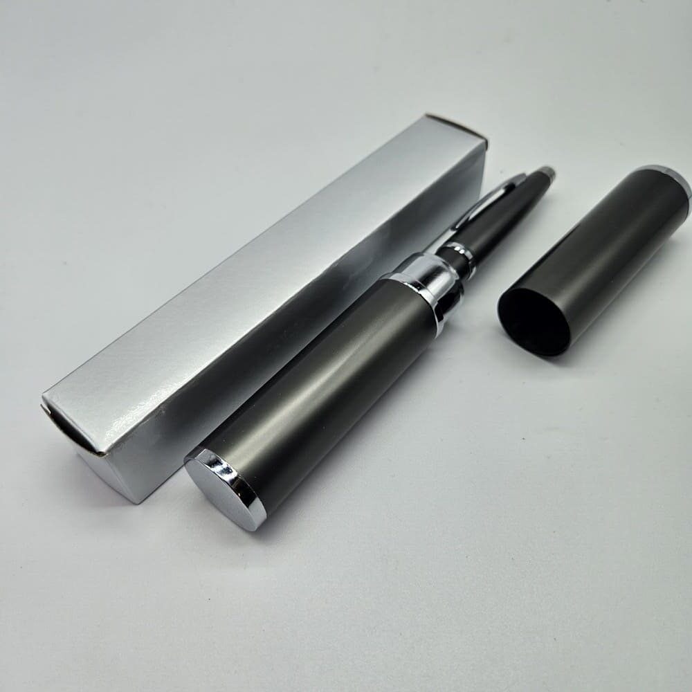 Penna a sfera in lacca metallizzata con minuterie in metallo cromato e meccanismo a rotazione. Custodia cilindrica coordinata. Inchiostro nero.