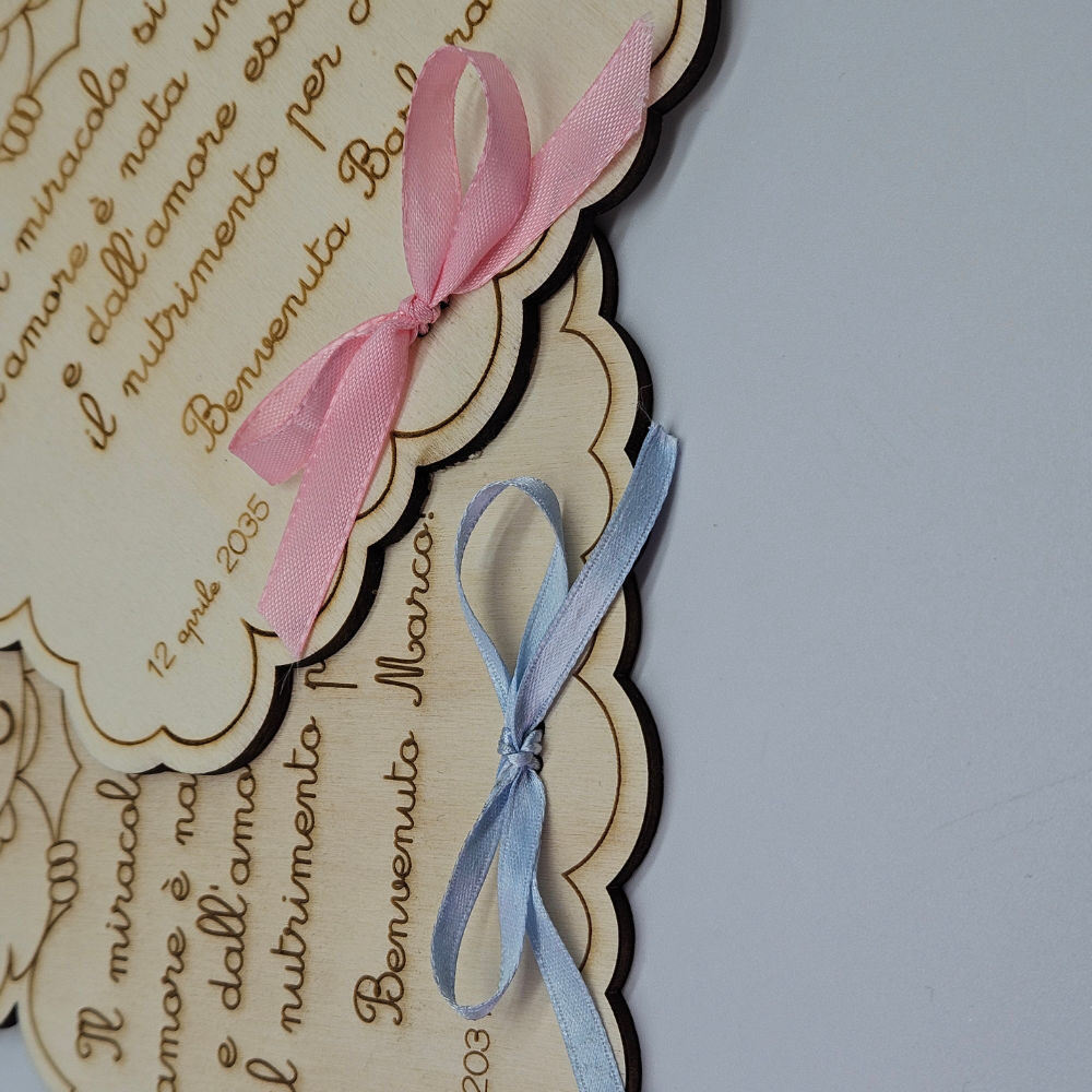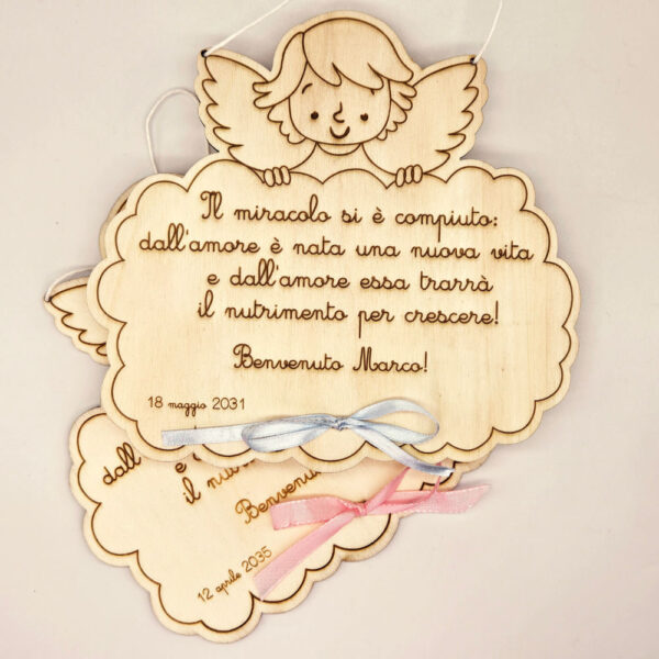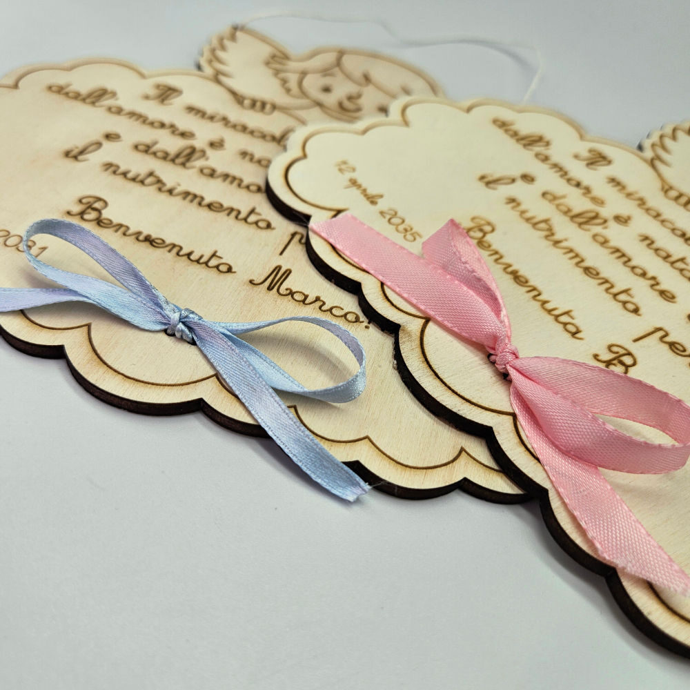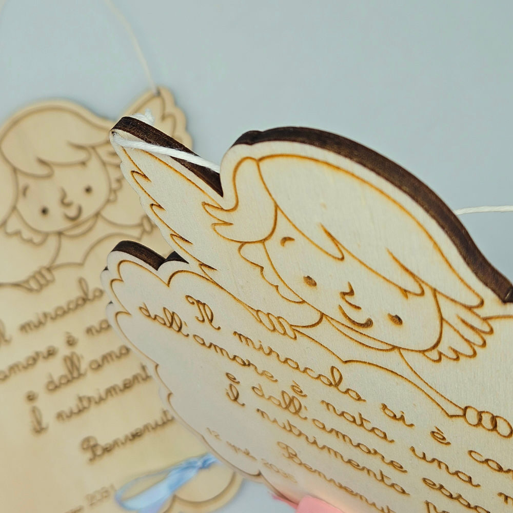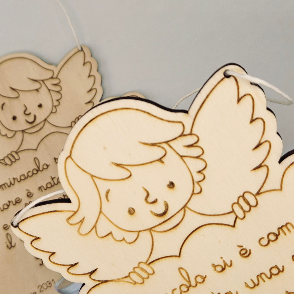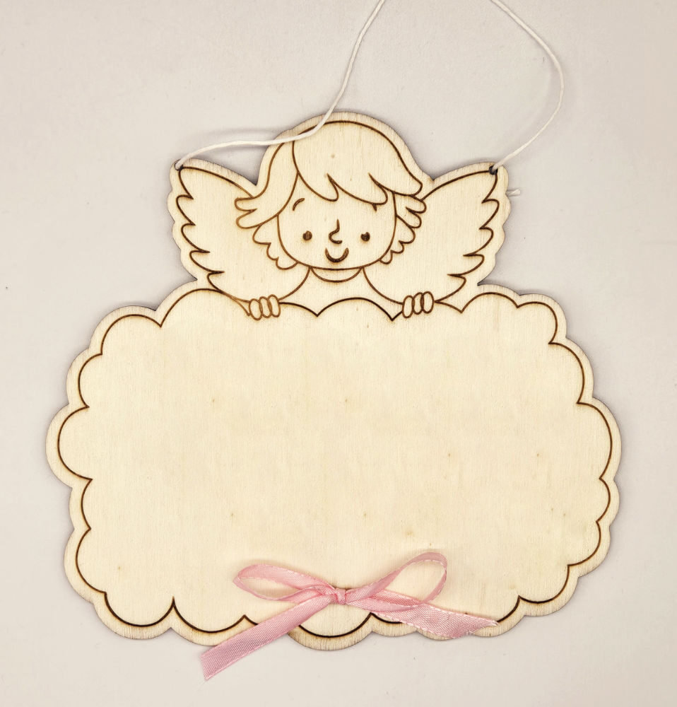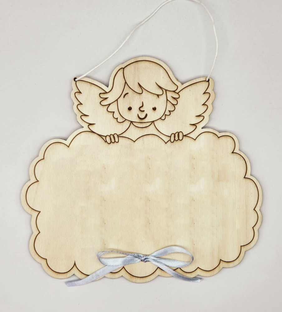 Ideale per una dedica alla nascita o per il battesimo questo angioletto accoglie il tuo messaggio inciso su legno compensato da 5 mm .